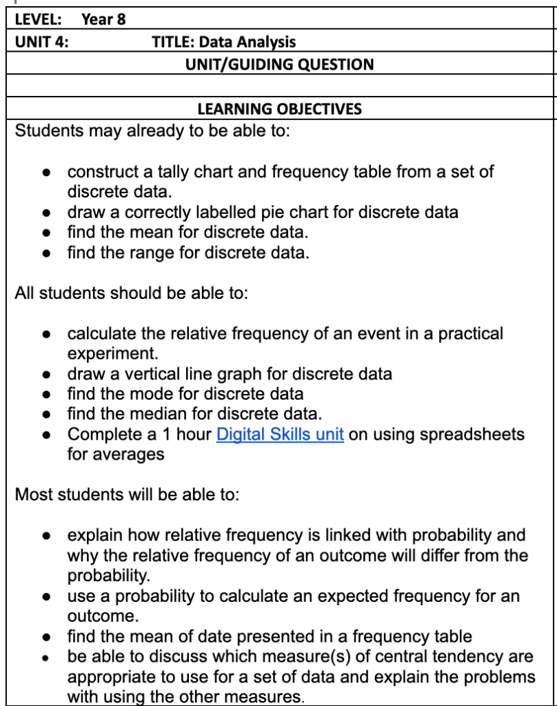 • Year 8 Unit 4: Data Analysis
